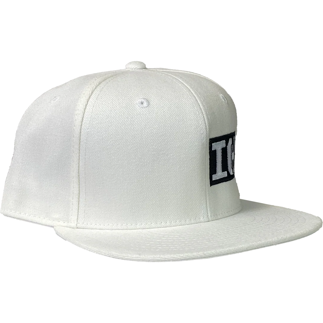 A unisex fitted flat bill hat in white with Insane Clown Posse "Block Logo" graphic embroidered on the front left panel.