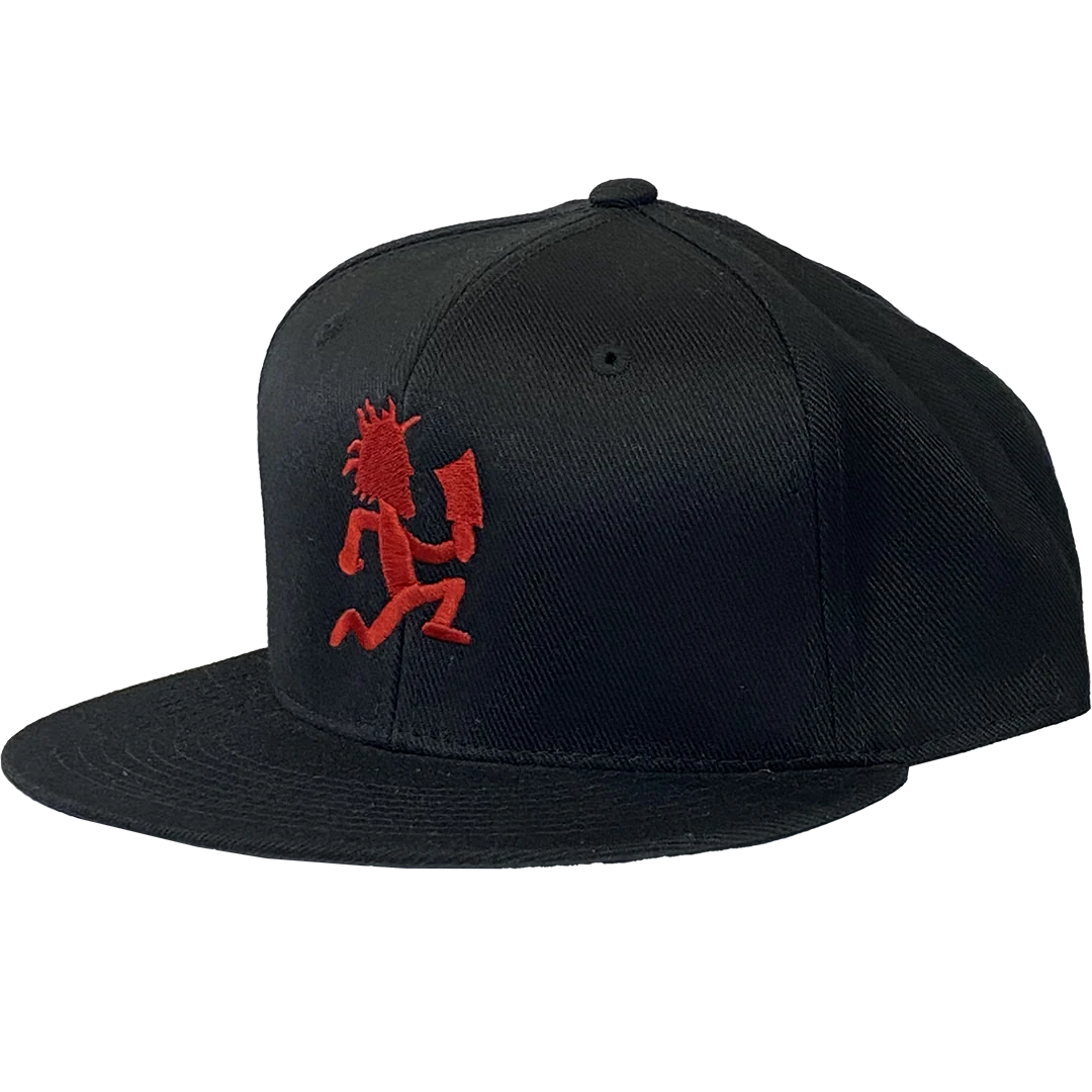 A unisex fitted flat bill hat in black with Insane Clown Posse "Hatchetman" graphic embroidered on the front.