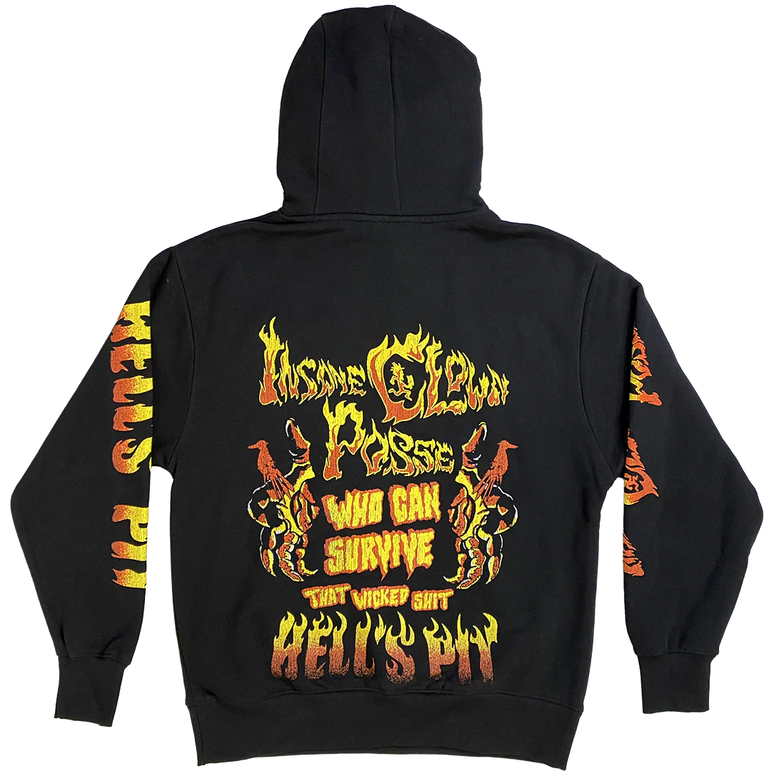 A unisex fleece pullover hoodie in black with Insane Clown Posse "Hell's Pit Hands" graphic printed on the front, "Who Can Survive?" graphic printed on the back, and "Insane Clown Posse" graphic printed on the right sleeve, and "Hell's Pit" graphic printed on the left sleeve. Features a custom Insane Clown Posse sewn in neck tag.