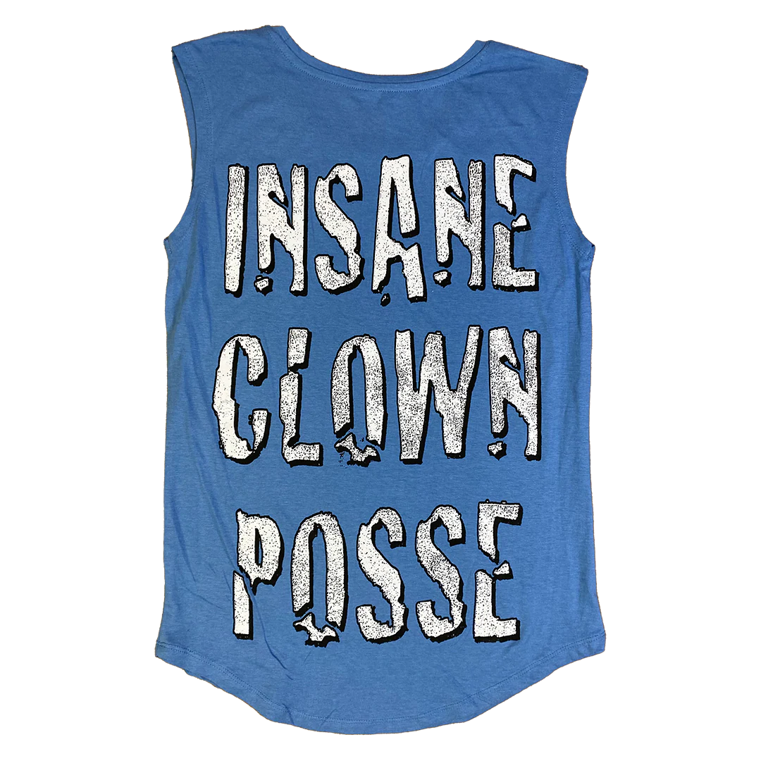 A womens sleeveless crewneck t-shirt in blue with Insane Clown Posse "Whadup" graphic printed on the front and "Insane Clown Posse" graphic printed on the back.