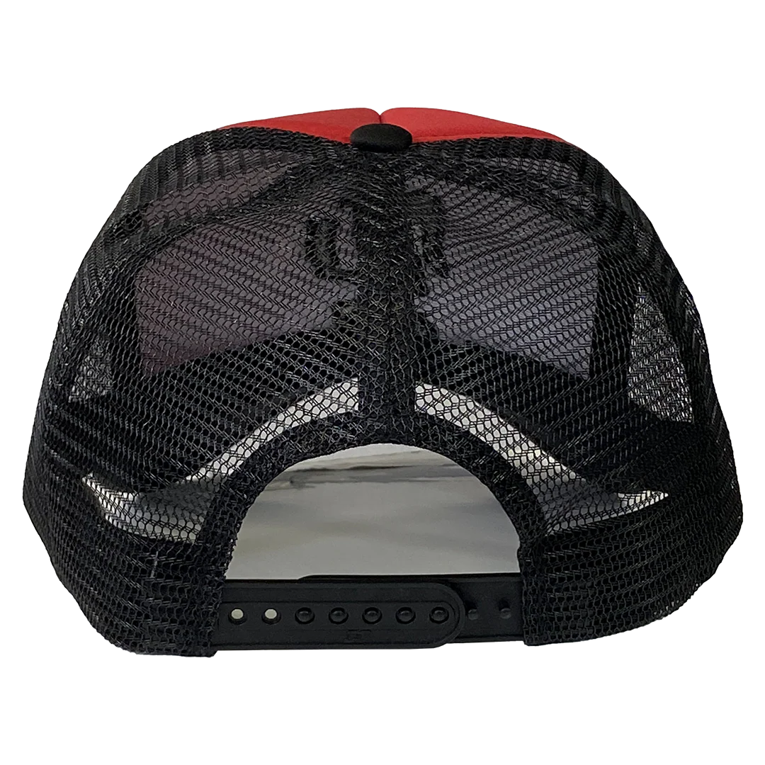 A unisex snapback foam trucker hat in black and red with Insane Clown Posse "Juggalette" graphic embroidered on the front.