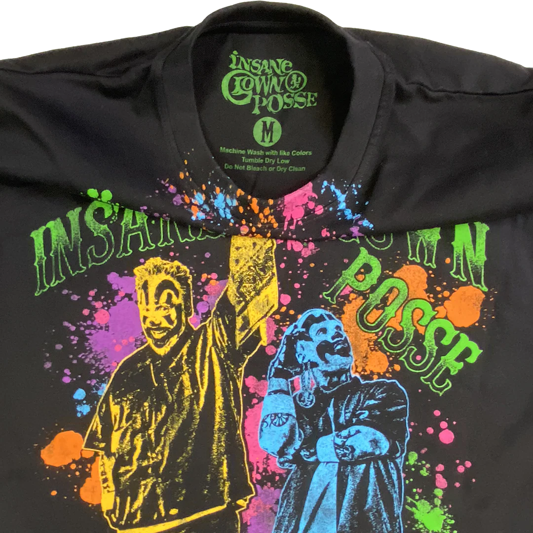A unisex crewneck t-shirt in black with Insane Clown Posse "Juggle This" graphic printed on the front. Includes a custom Insane Clown Posse neck label print.
