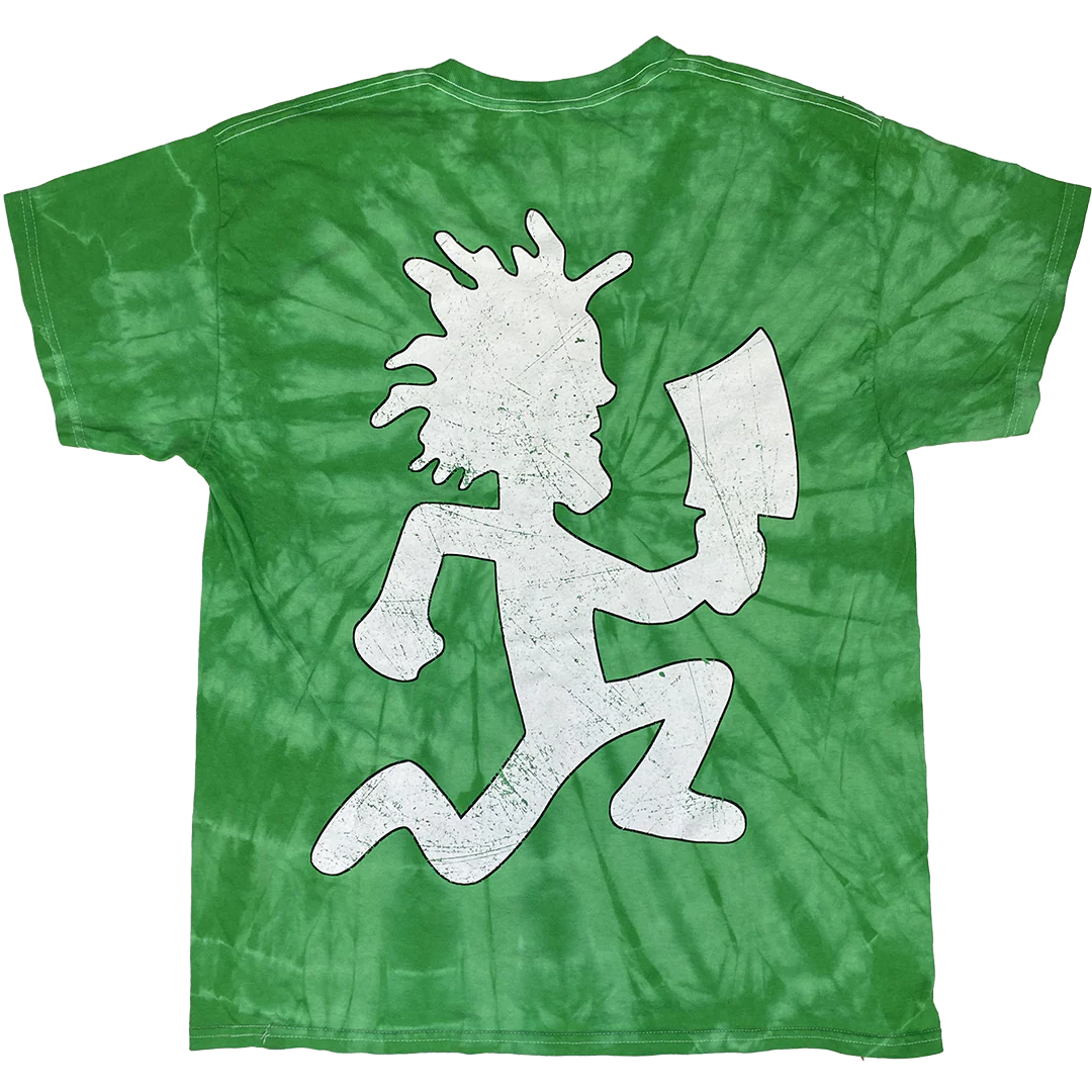 A unisex crewneck t-shirt in tie dye green with Insane Clown Posse "Melting Faces" graphic printed on the front and "Hatchetman" graphic printed on the back