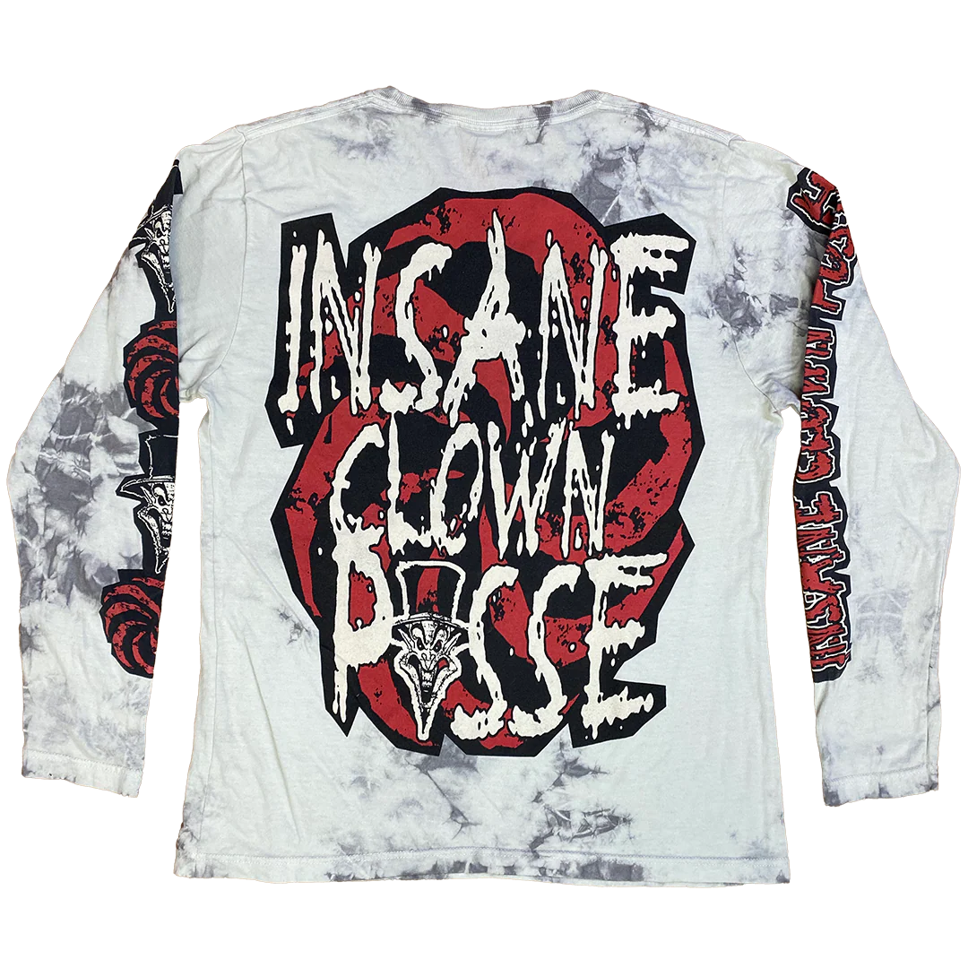 A womens crewneck long sleeve t-shirt in custom cloud grey wash dye with Insane Clown Posse "Ringmaster Spiral" graphic printed on the front. Includes a custom Insane Clown Posse neck label print.