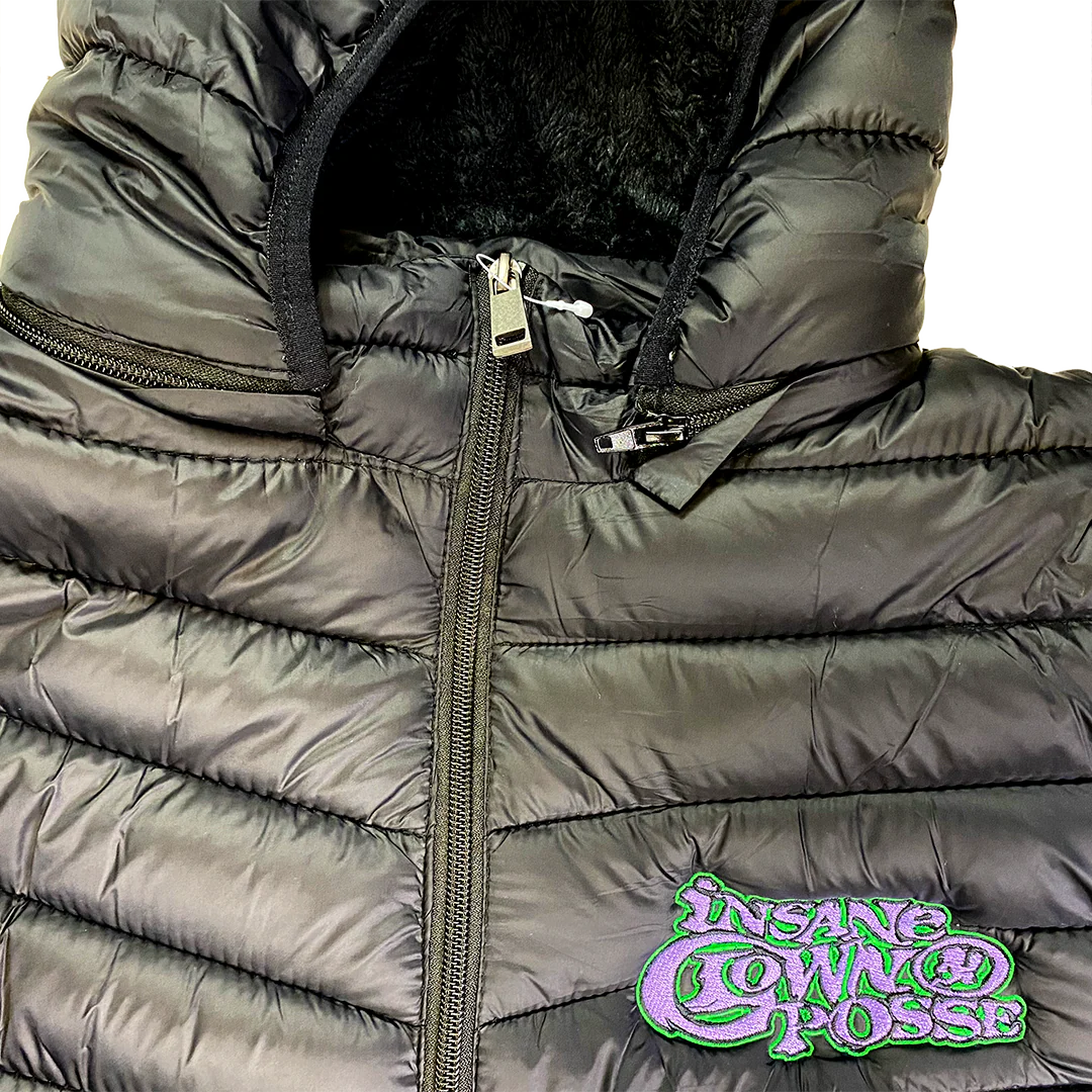 A unisex hooded puffer jacket in black with Insane Clown Posse "Stack Logo" graphic embroidered on the front and "Hatchetman" graphic embroidered on the right shoulder. Features a removable hood, and soft interior lining.